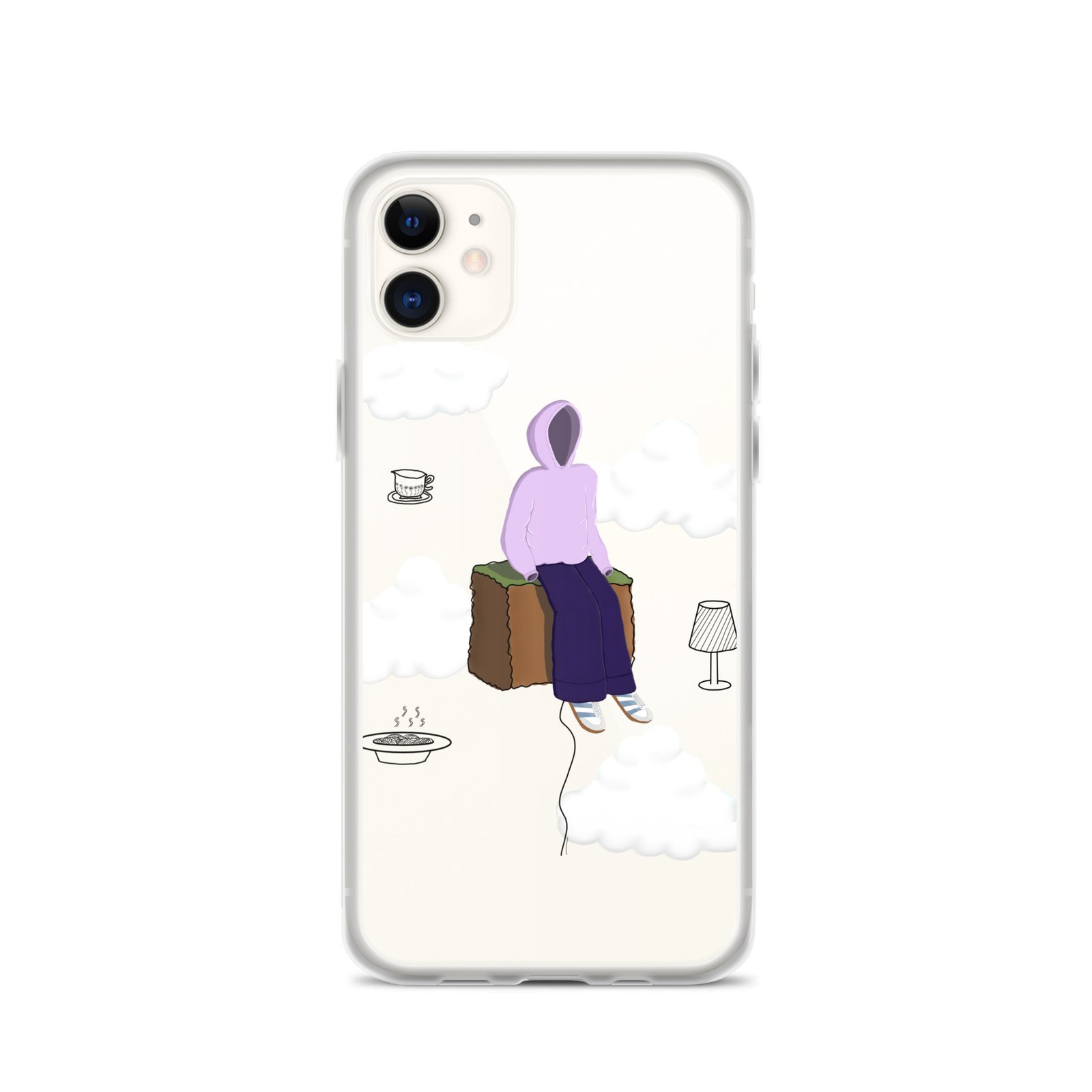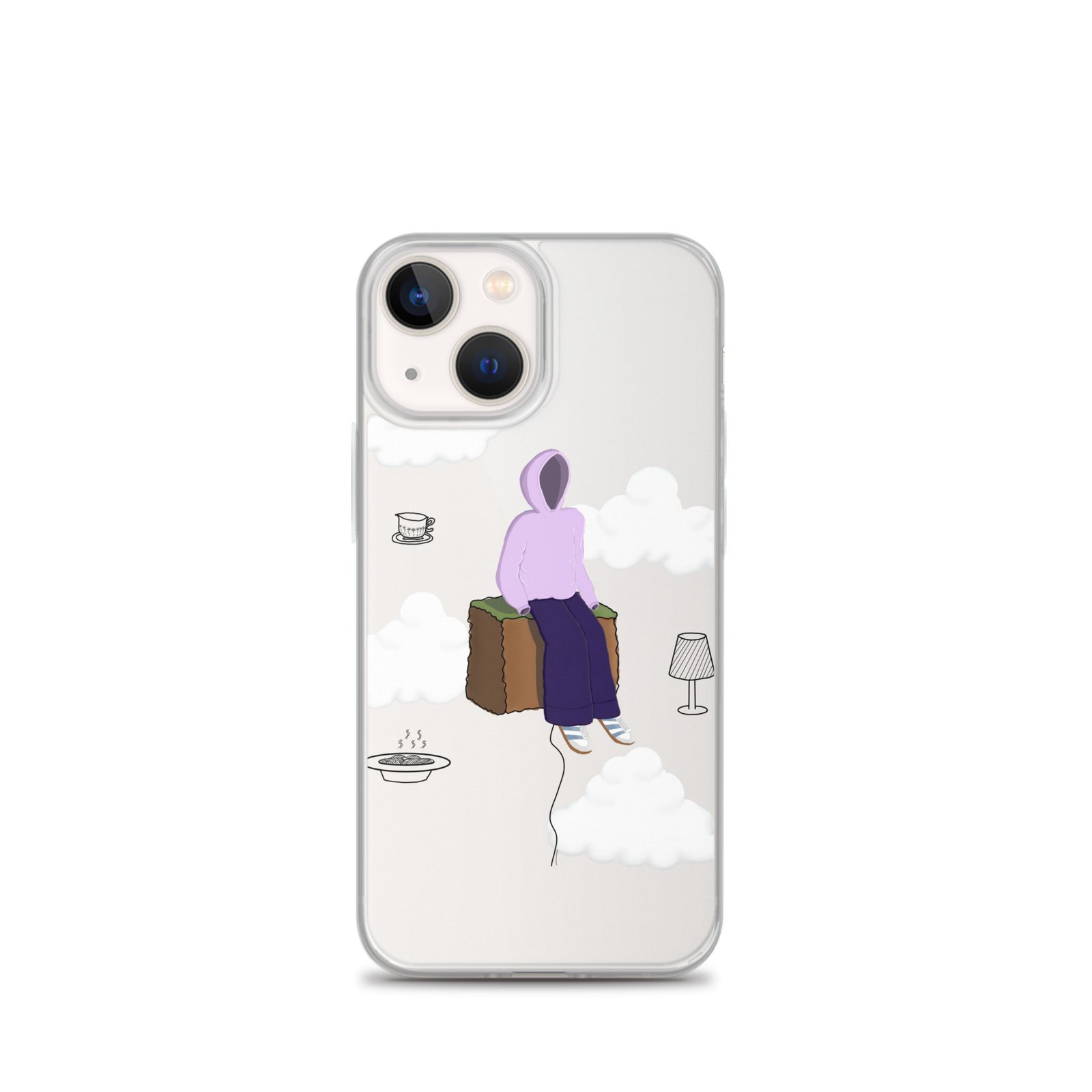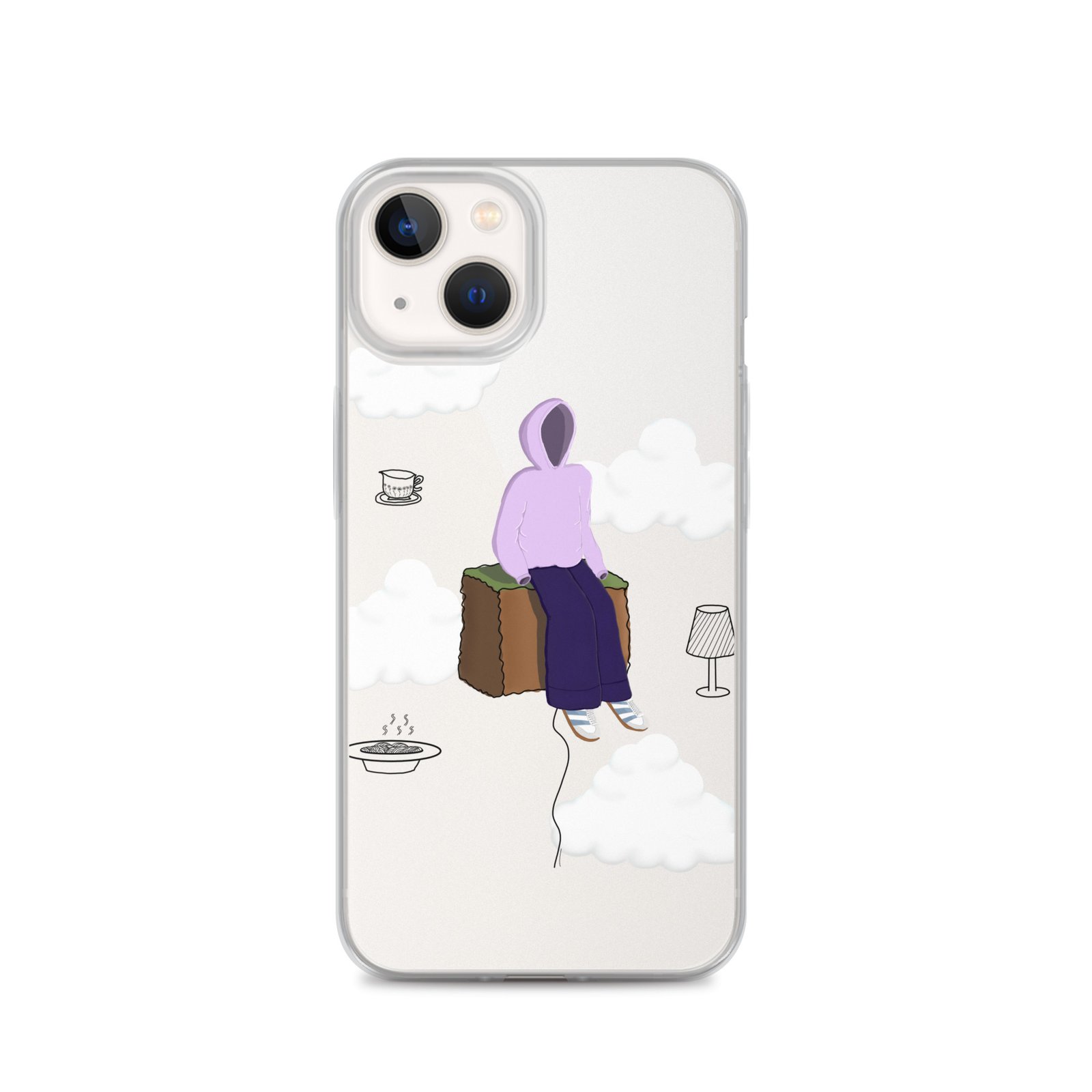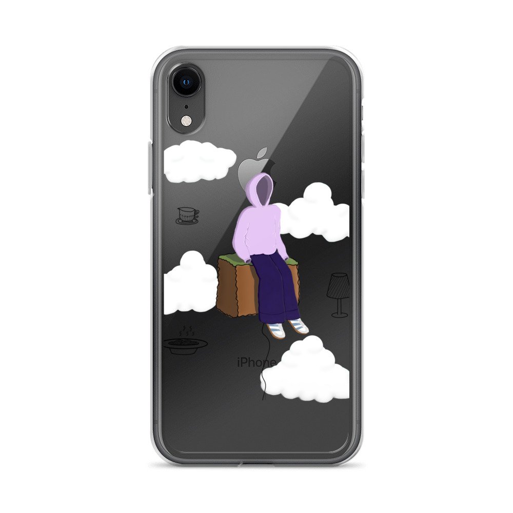 The Just Chill art clear iPhone case by Cloudy Things features original digital artwork designed to remind you to slow down, sit with yourself and simply exist in peace.