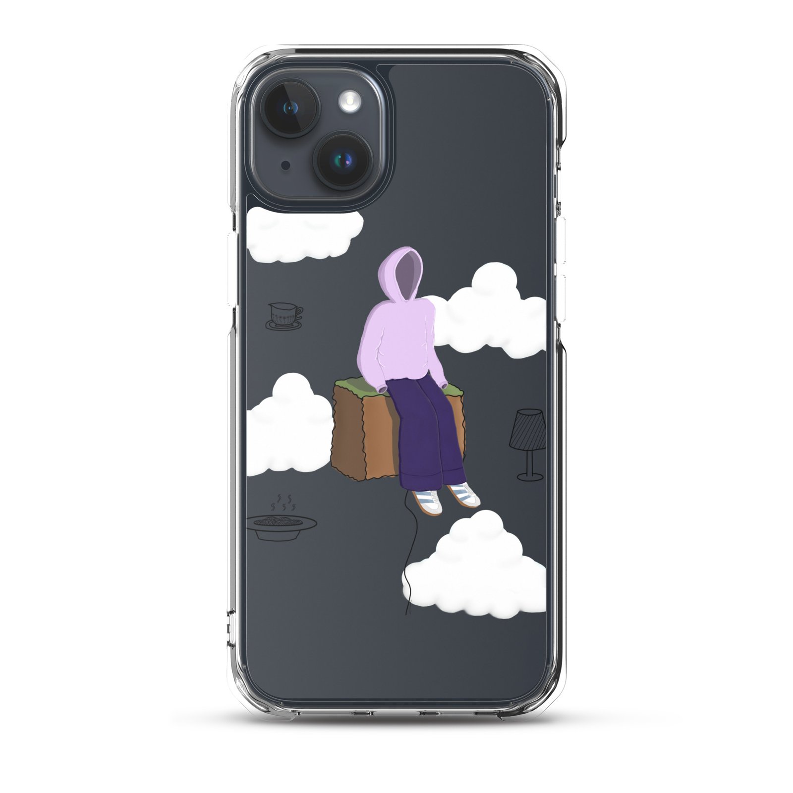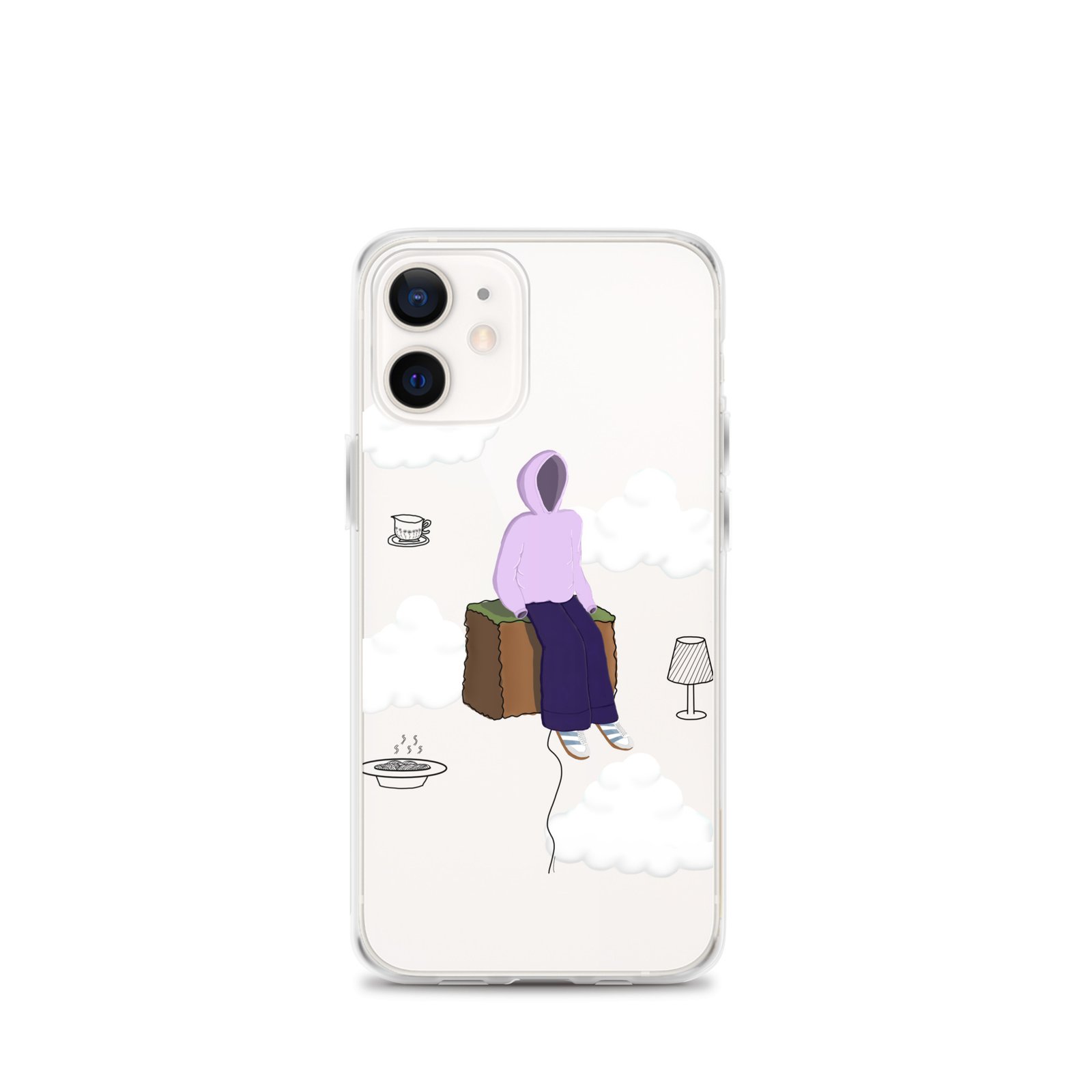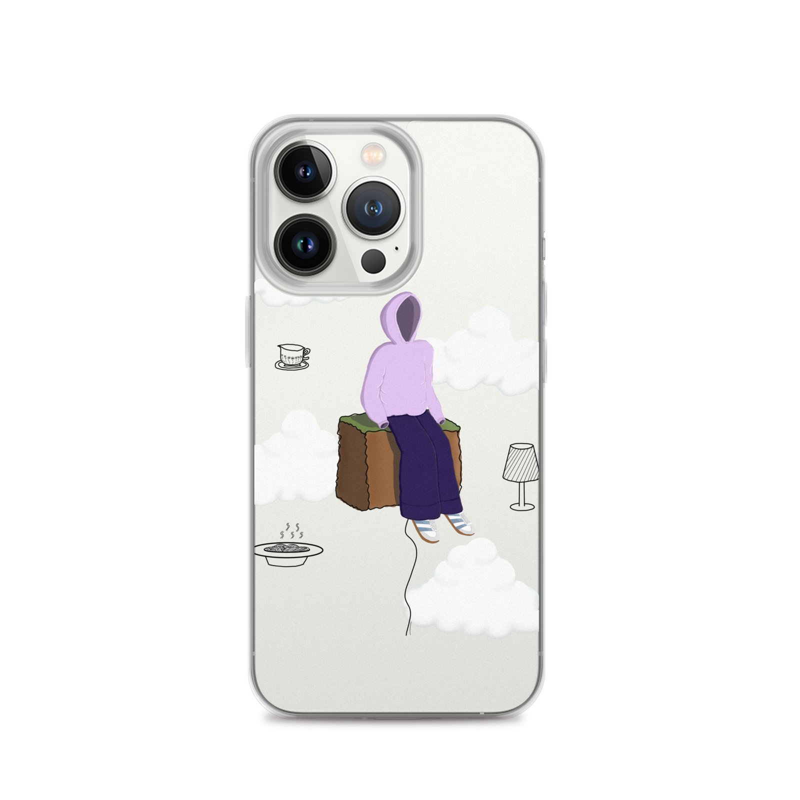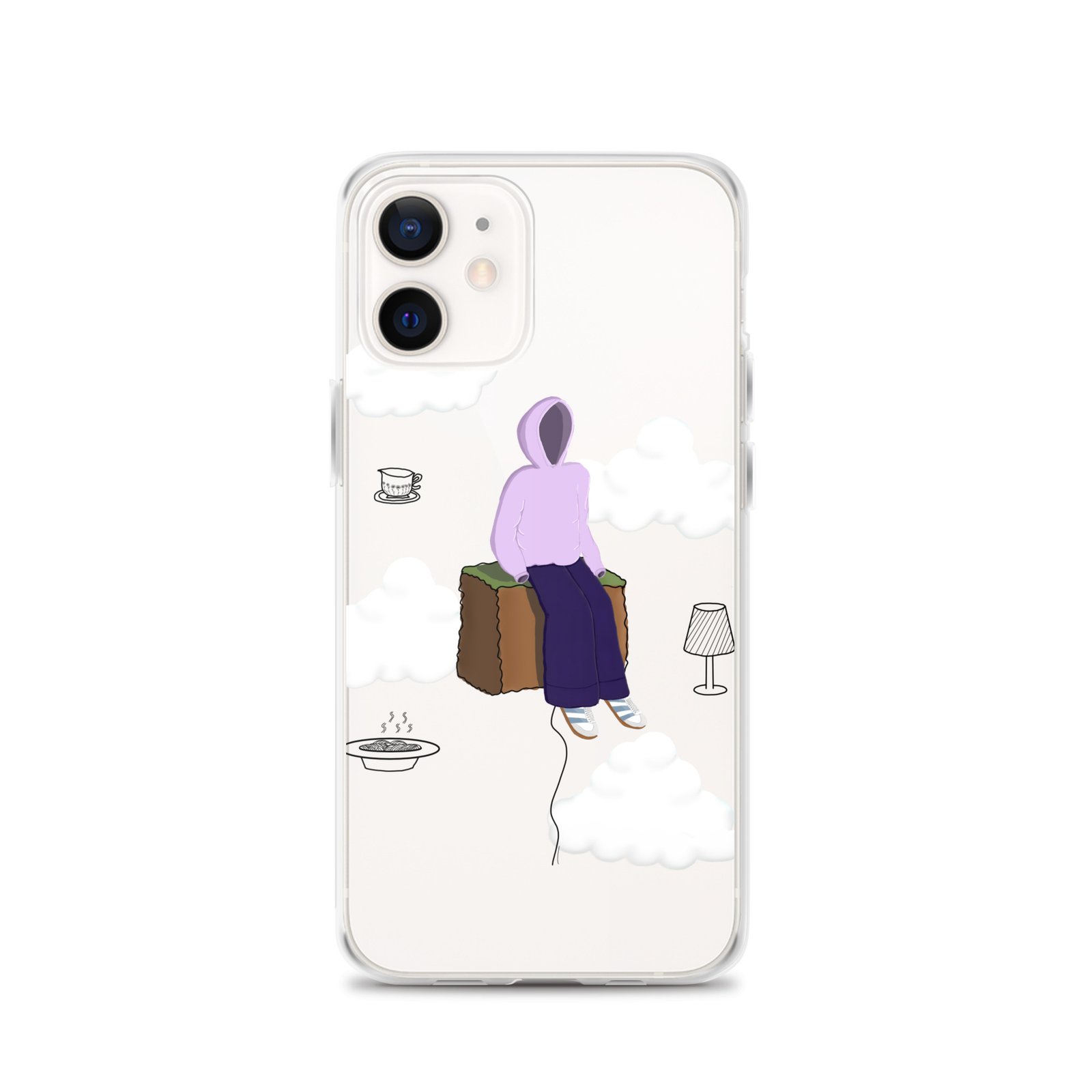 The Just Chill art clear iPhone case by Cloudy Things features original digital artwork designed to remind you to slow down, sit with yourself and simply exist in peace.