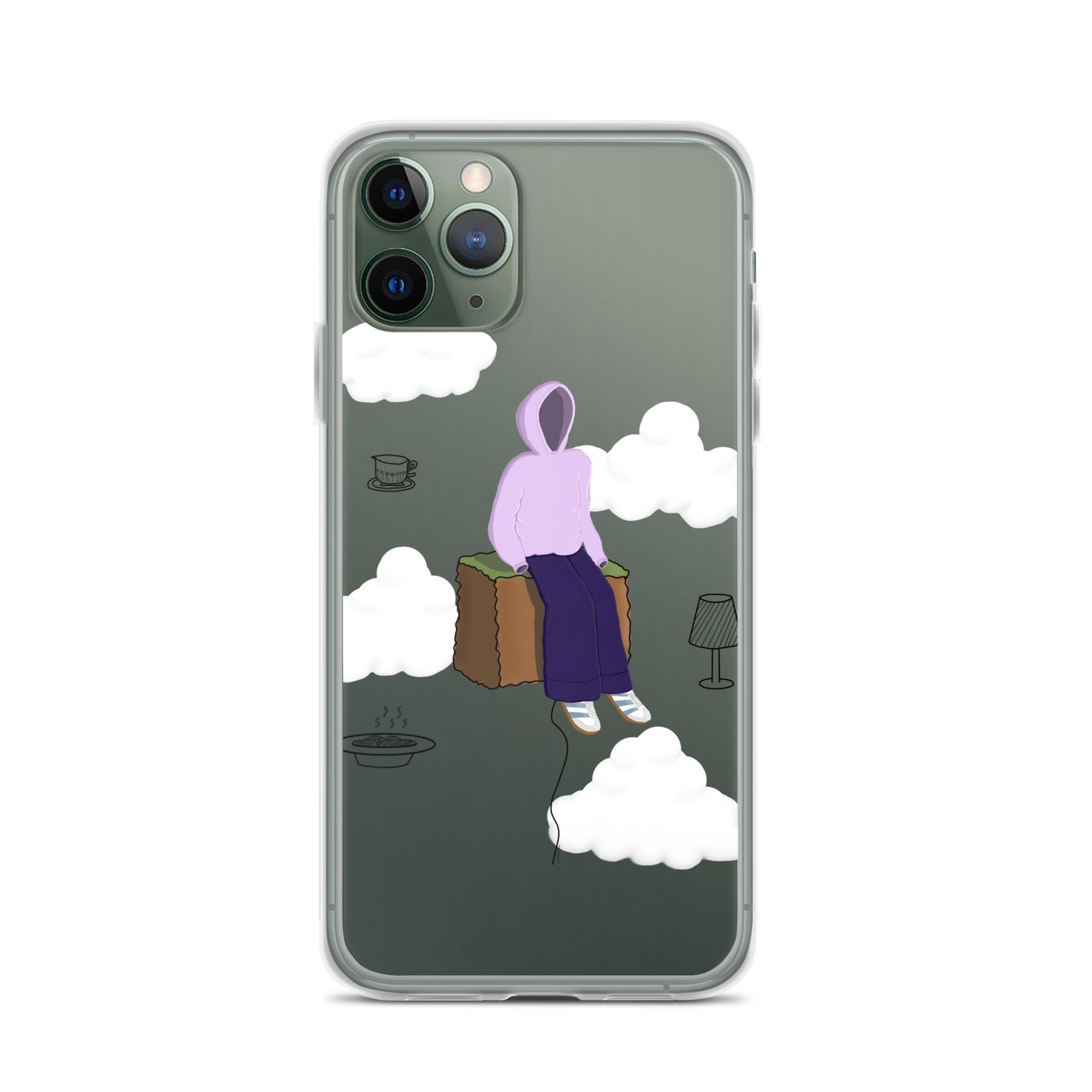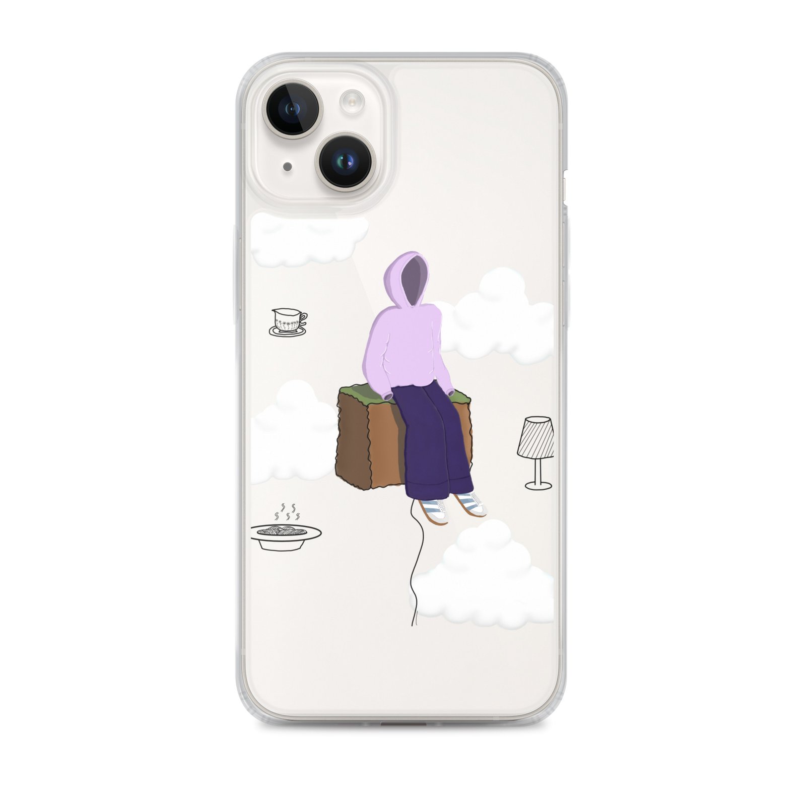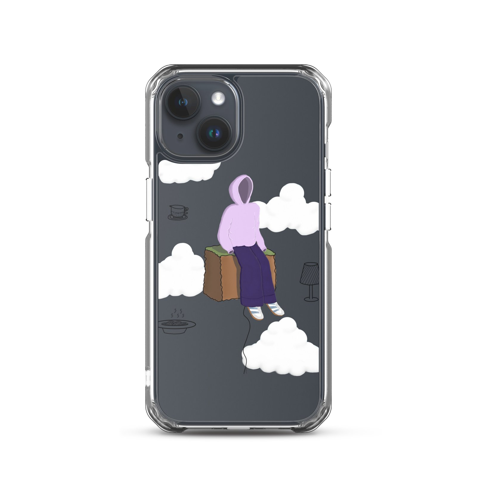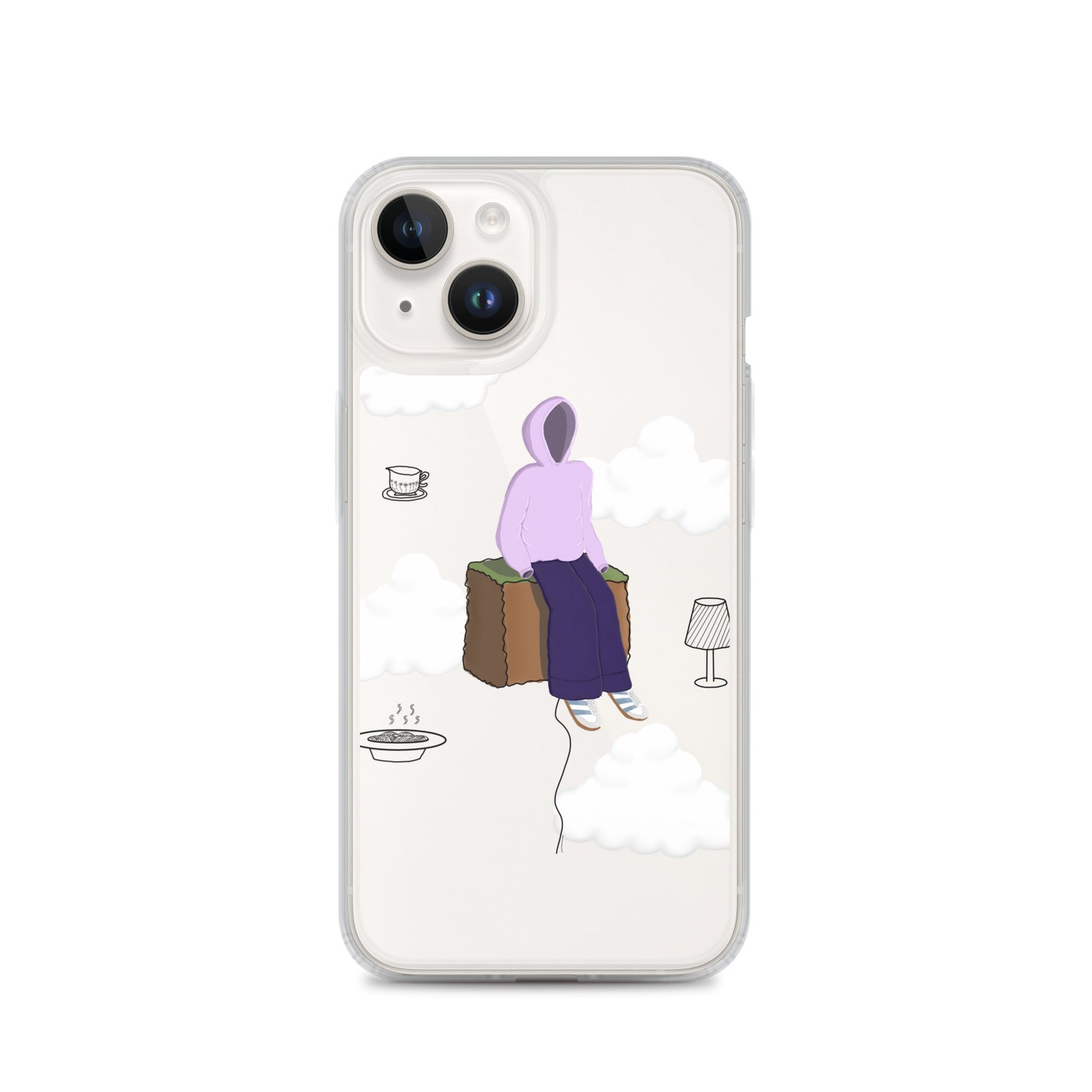 The Just Chill art clear iPhone case by Cloudy Things features original digital artwork designed to remind you to slow down, sit with yourself and simply exist in peace.